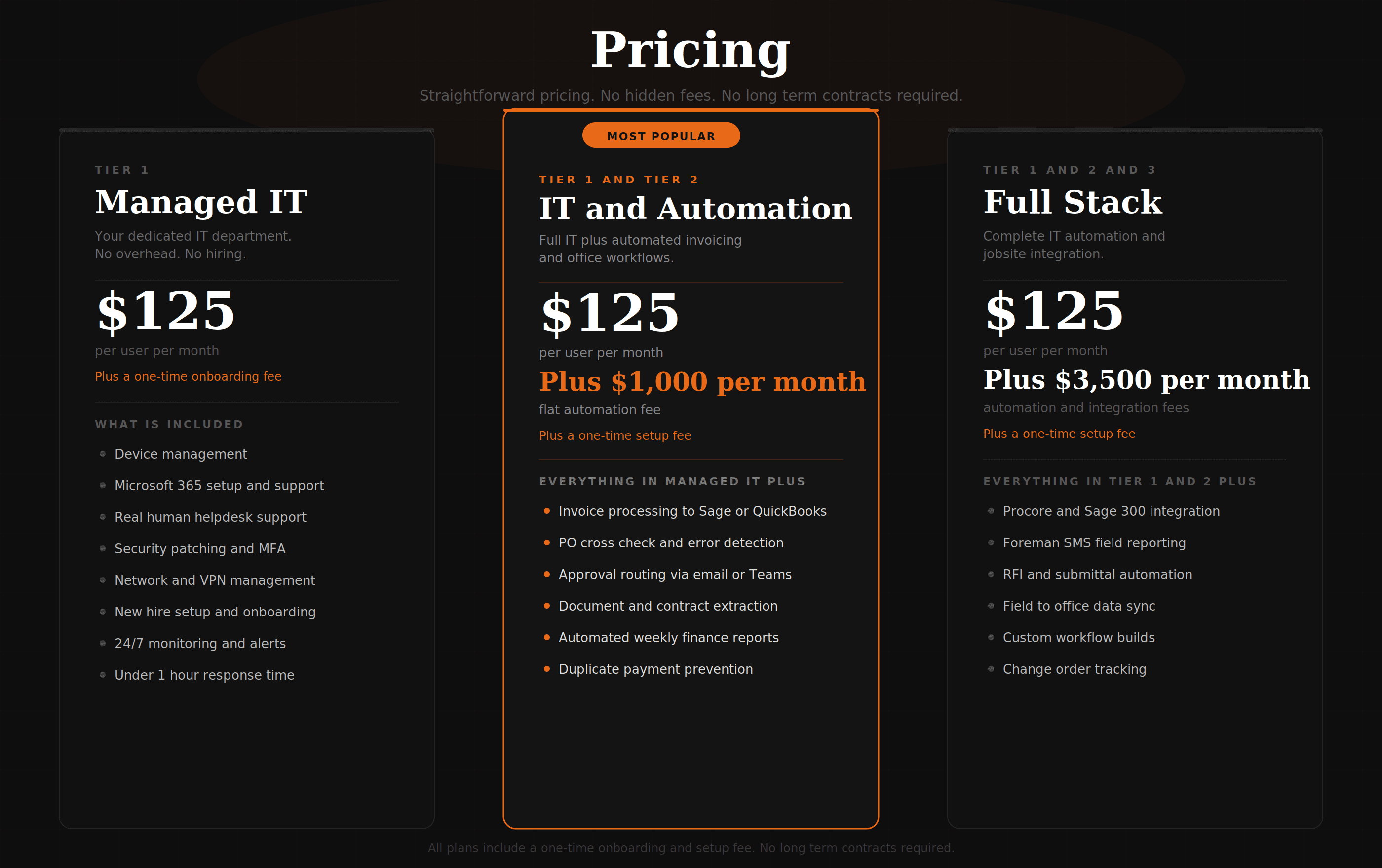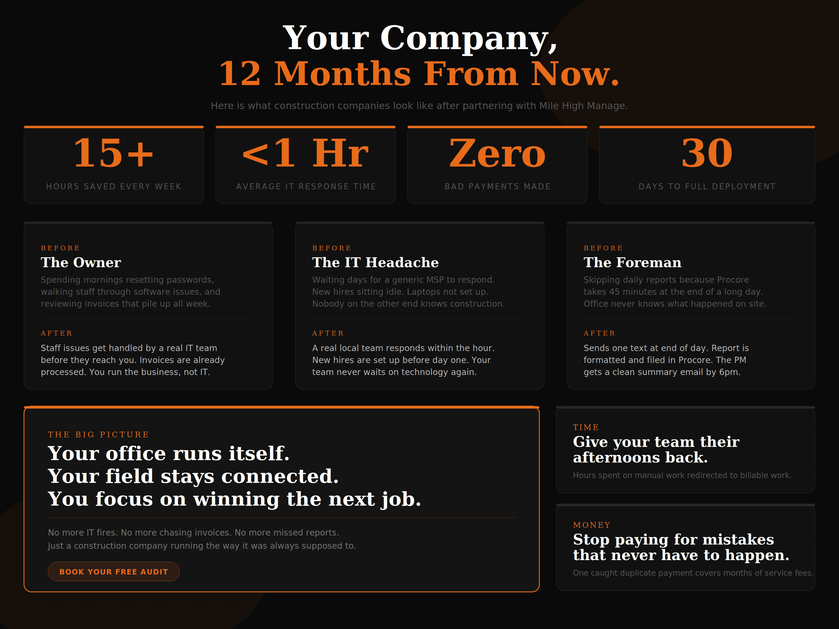 Book a free 30 minute audit. We will walk through your current setup, find exactly where your team is losing hours, and show you what a construction company running on modern IT actually looks like. No pitch. No obligation. Just straight answers.